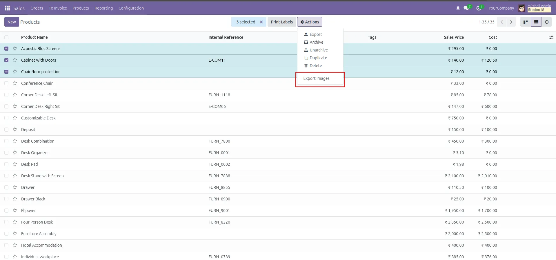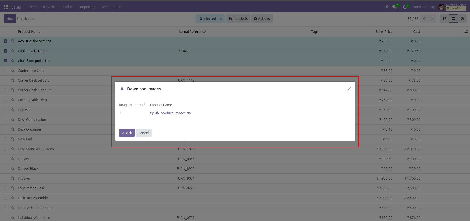 Yes, this module allows you to select multiple products and perform a bulk product image export in Odoo with one click.
