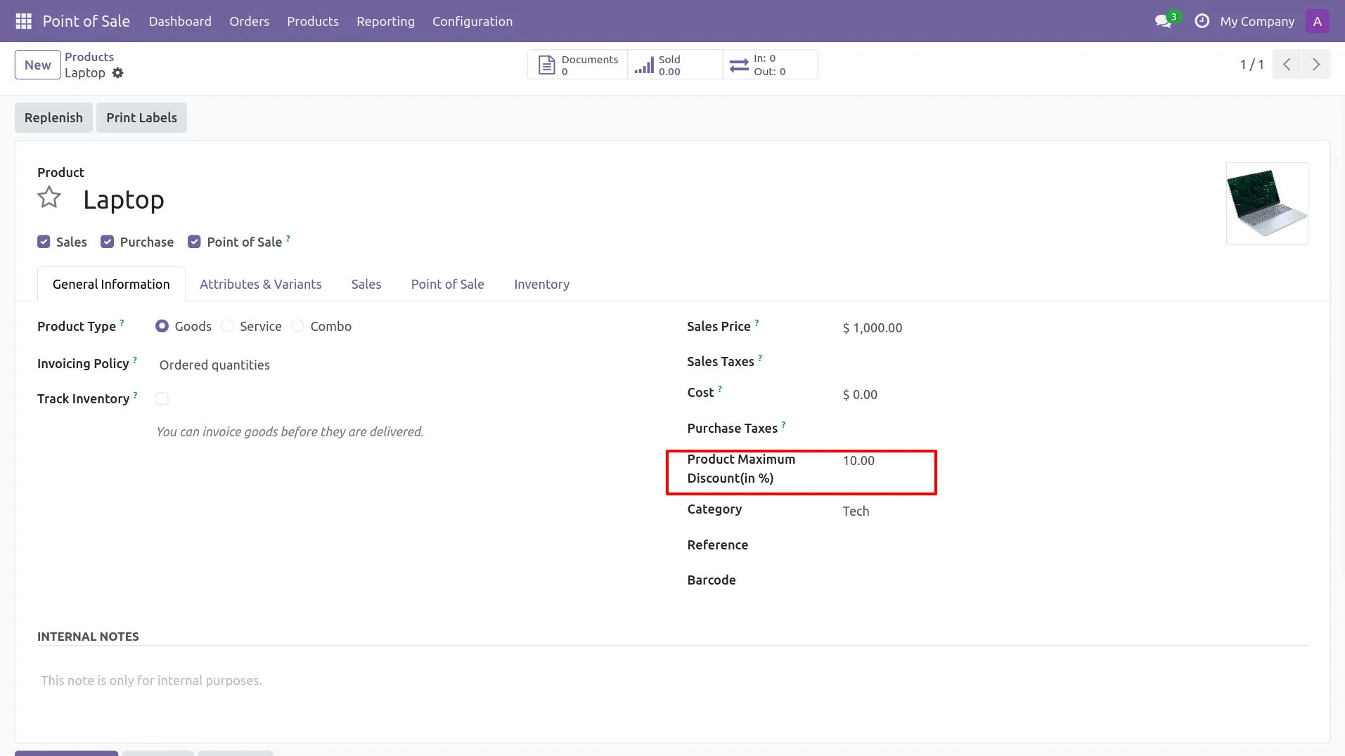 10.In Point of Sale module, Product Maximum Discount (in %) is also visible/configurable on the product form (Laptop = 10%).