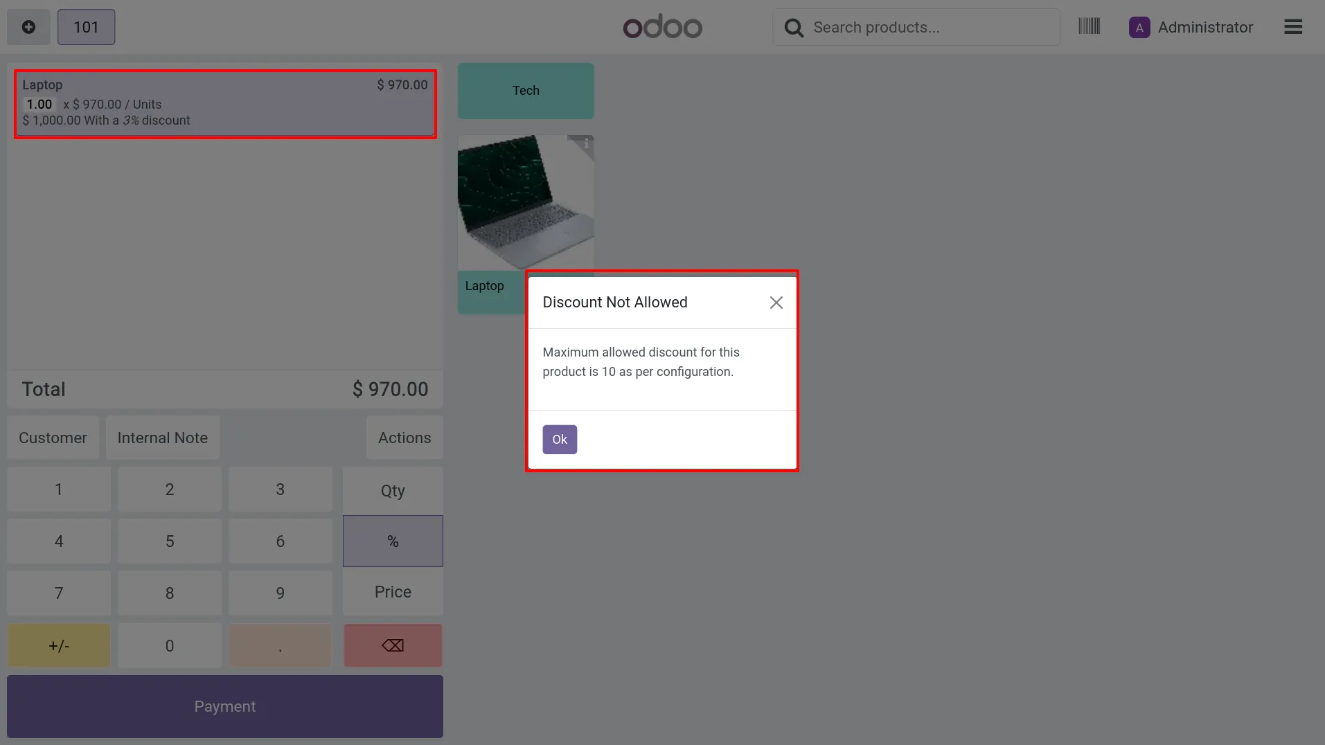 12.POS shows “Discount Not Allowed” popup when user tries to apply a discount higher than the maximum allowed (Max 10%).