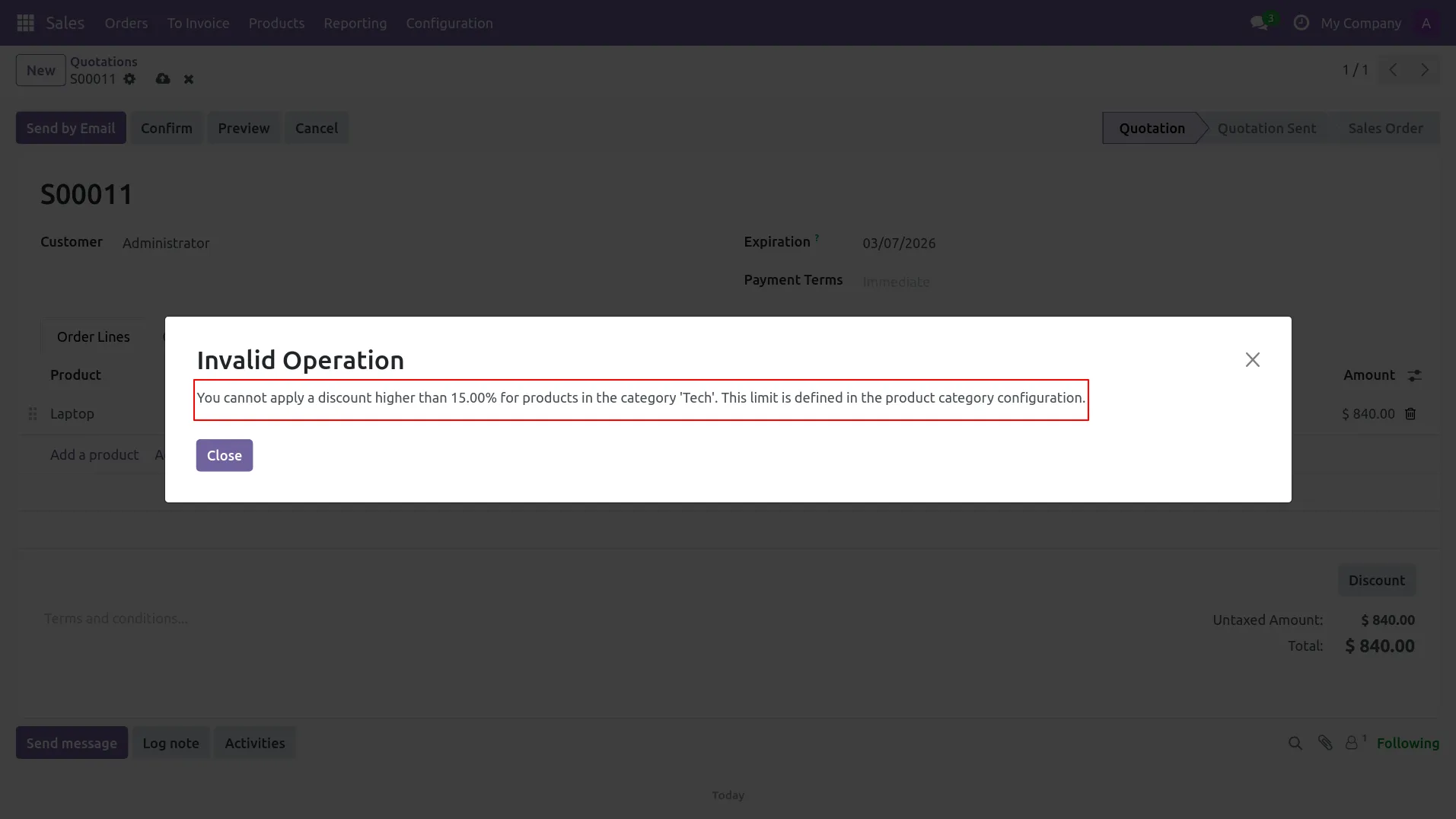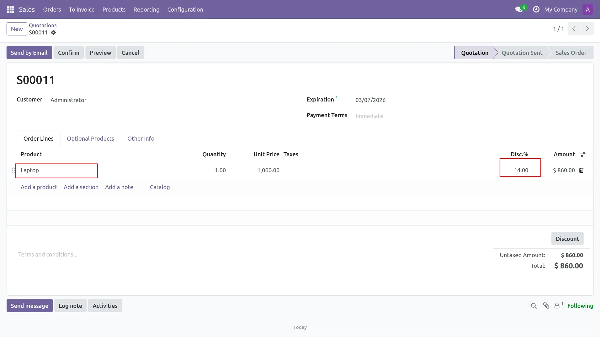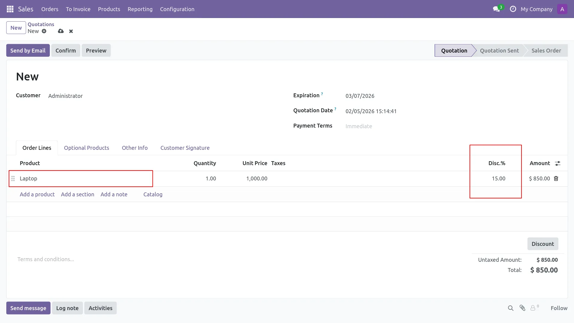 2.In Sales Quotation, user applies 15% discount on Laptop order line.