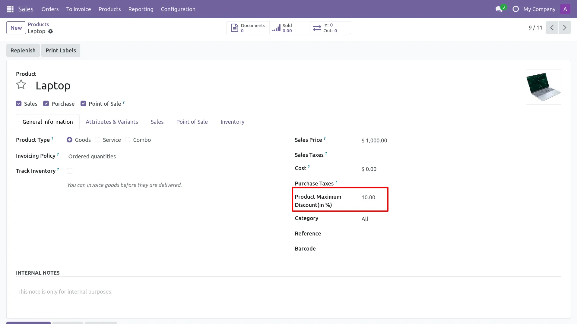 10.In Point of Sale module, Product Maximum Discount (in %) is also visible/configurable on the product form (Laptop = 10%).