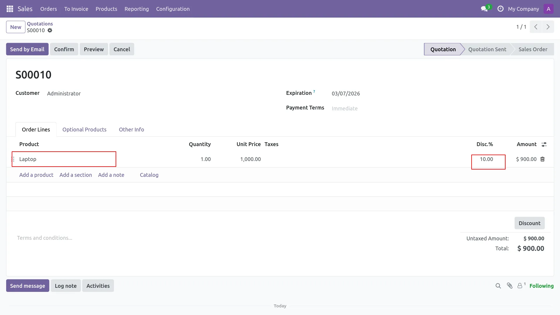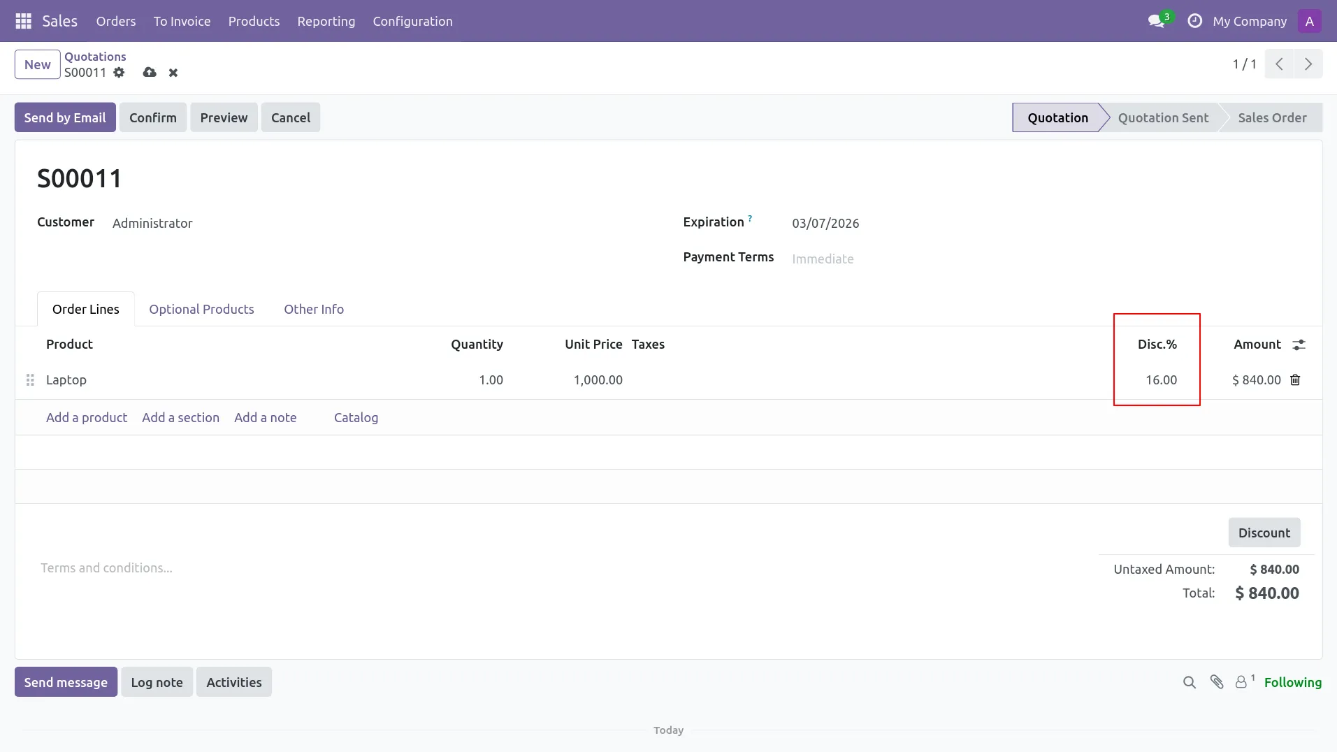 2.In Sales Quotation, user applies 15% discount on Laptop order line.