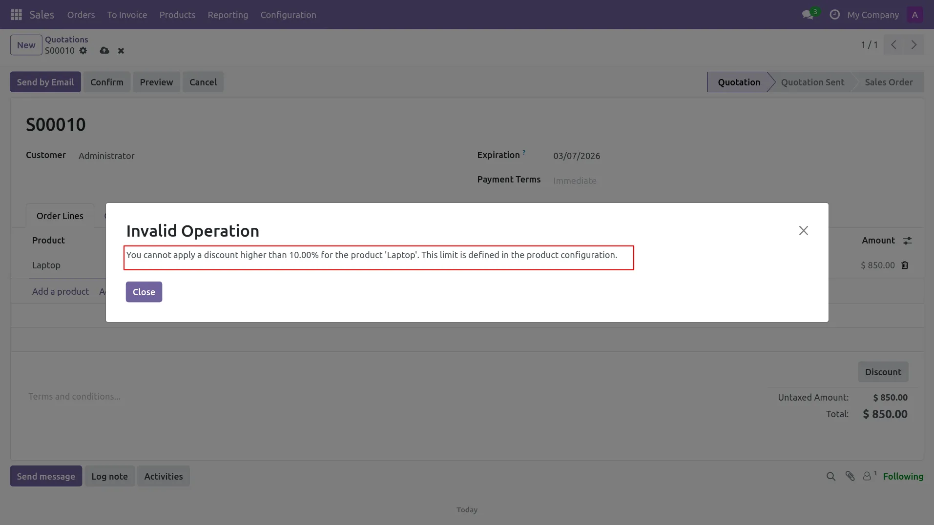 3.System shows “Invalid Operation” popup because discount exceeds product limit (Max 10%).