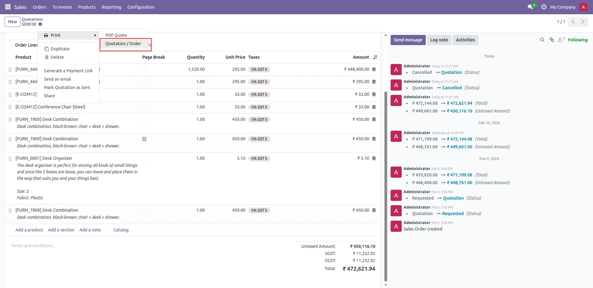 4.Click Print → Quotation/Order to download the PDF.